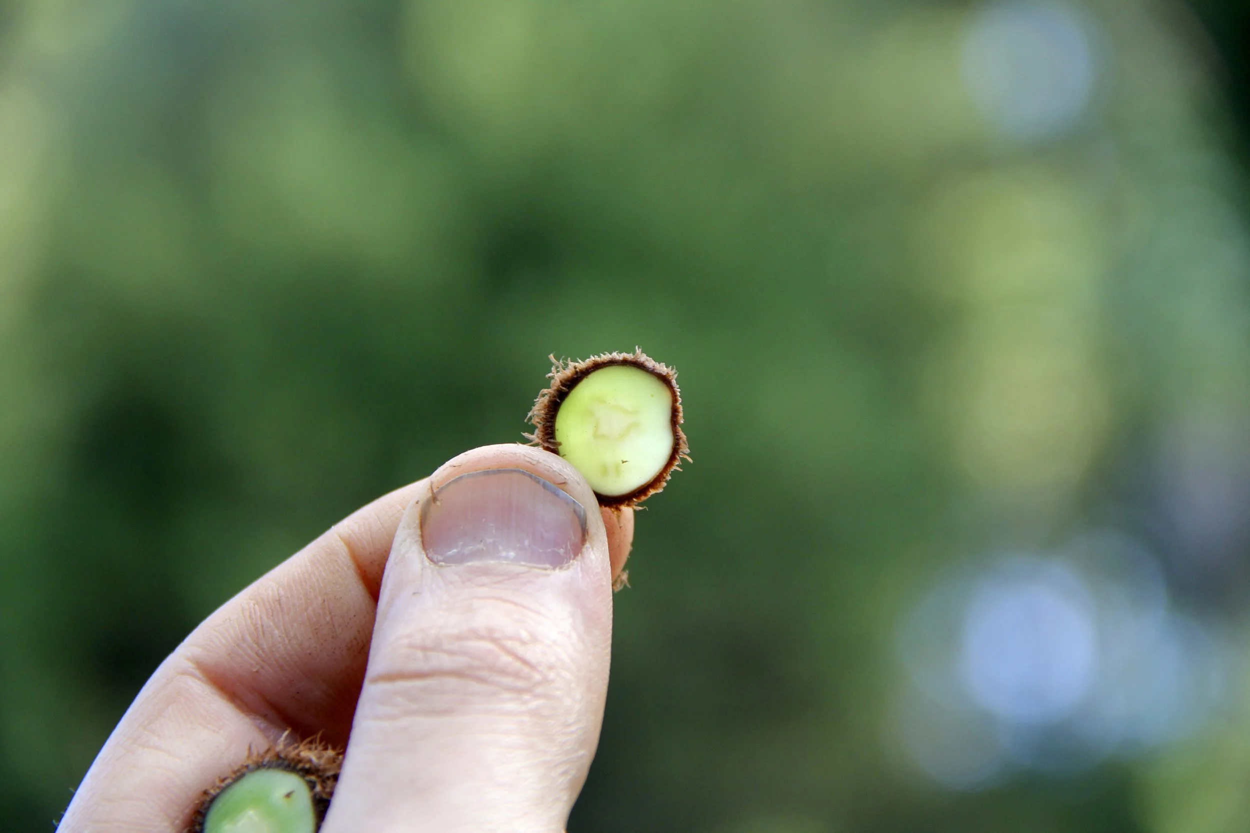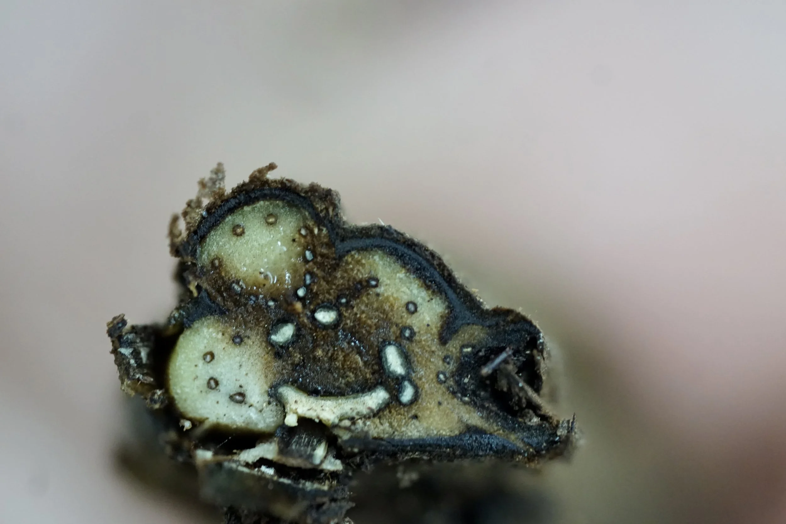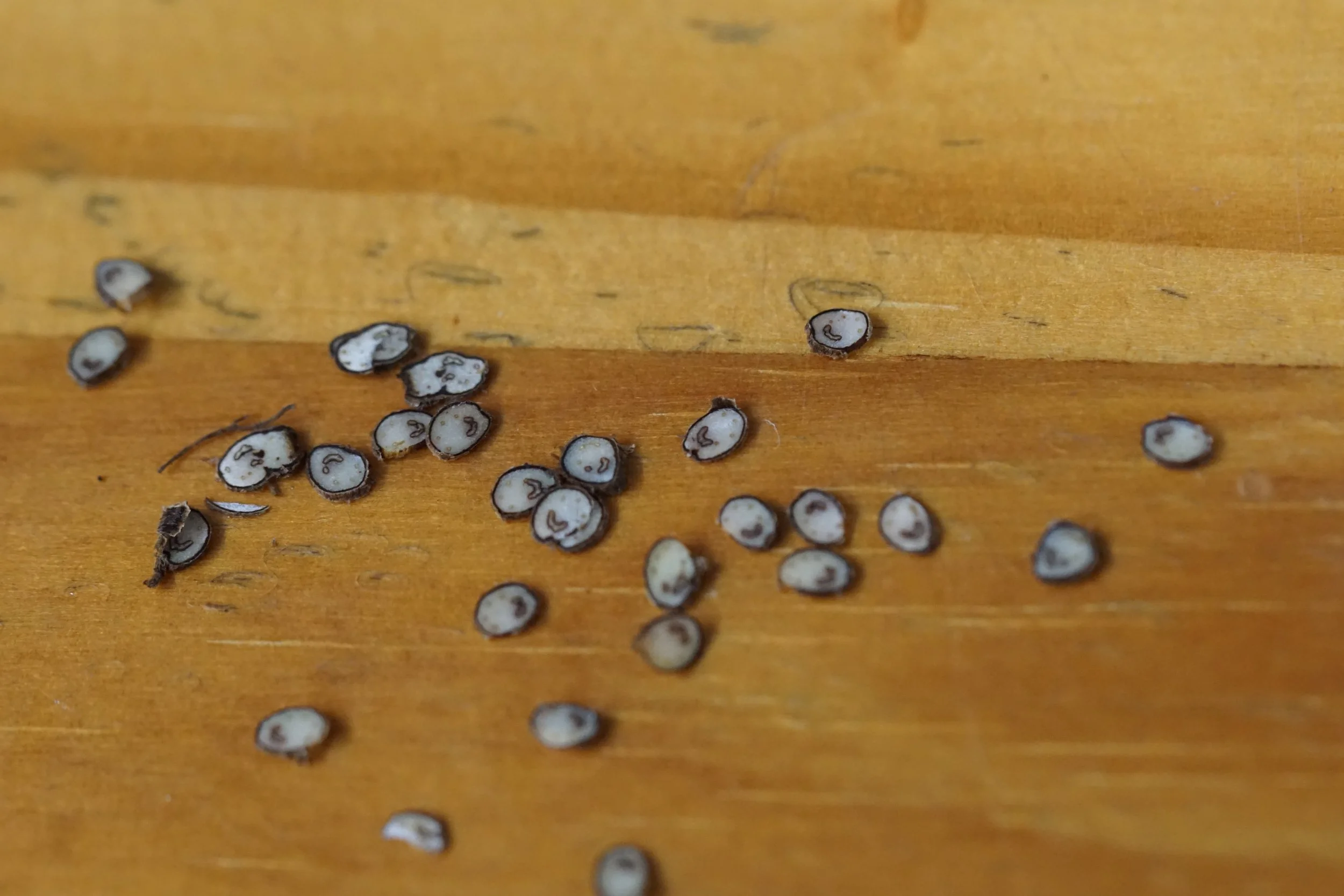Sections of fern stem on a table after I cut through the length of it to see how the vascular architecture changes throughout.