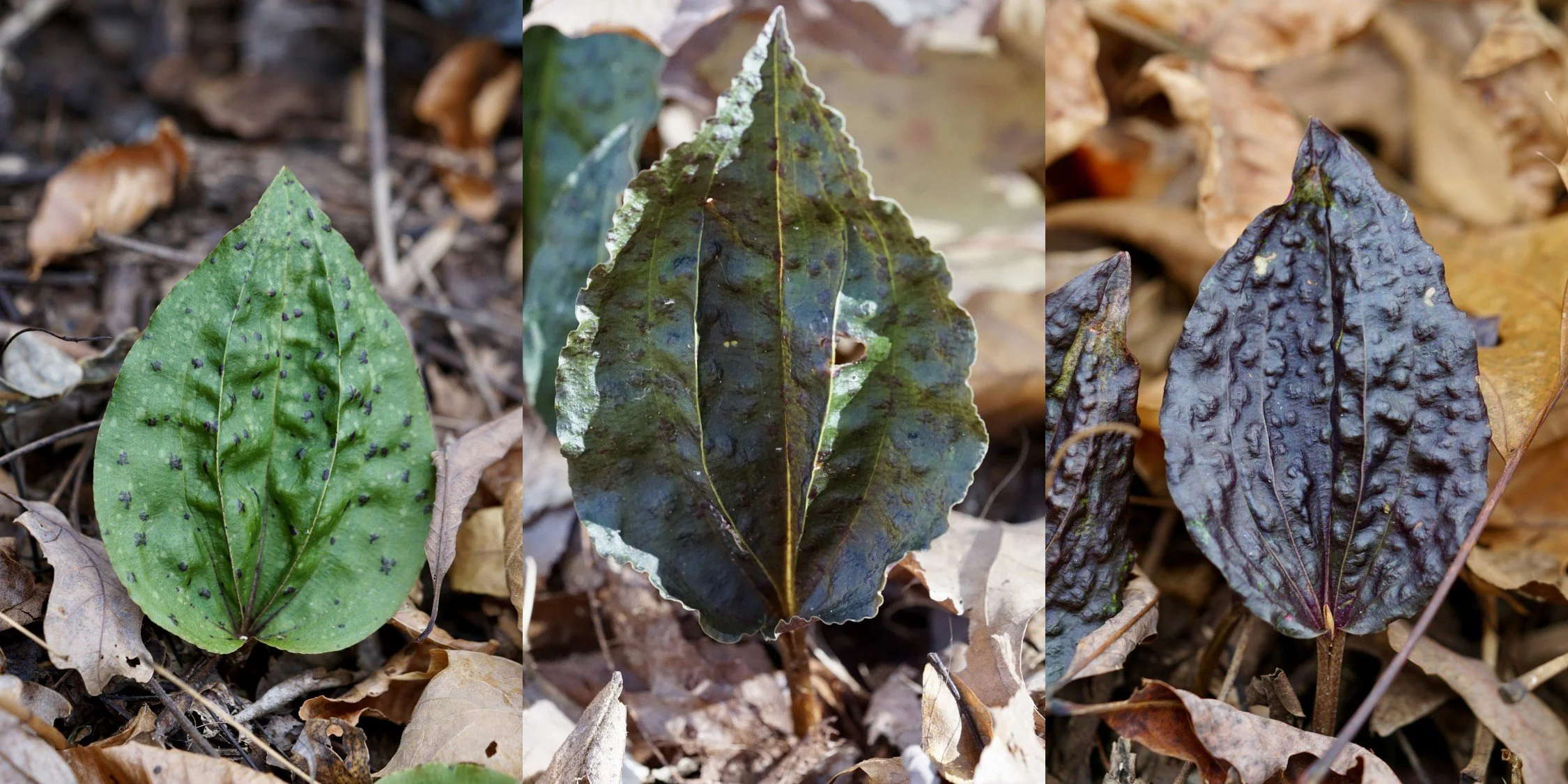 The drastically different colors of greens, blacks, and speckles of the Cranefly orchid have always caught my eye. There are many understory herbs that produce evergreen leaves which turn red in the winter. For instance, some species like little brown jug (Hexastylis brevifolia), common ivy (Hedera helix), or even the cut-leaf grape fern (Sceptridium dissectum) can upregulate anthocyanin production in the winter, turning a single green leaf red. This change occurs each year depending on temperature and sunlight. Indeed, once I stumbled upon a cut-leaf grape fern where one leaflet overlapped another. The part of the leaf that was exposed to the sun was red, while the covered leaflet was green.