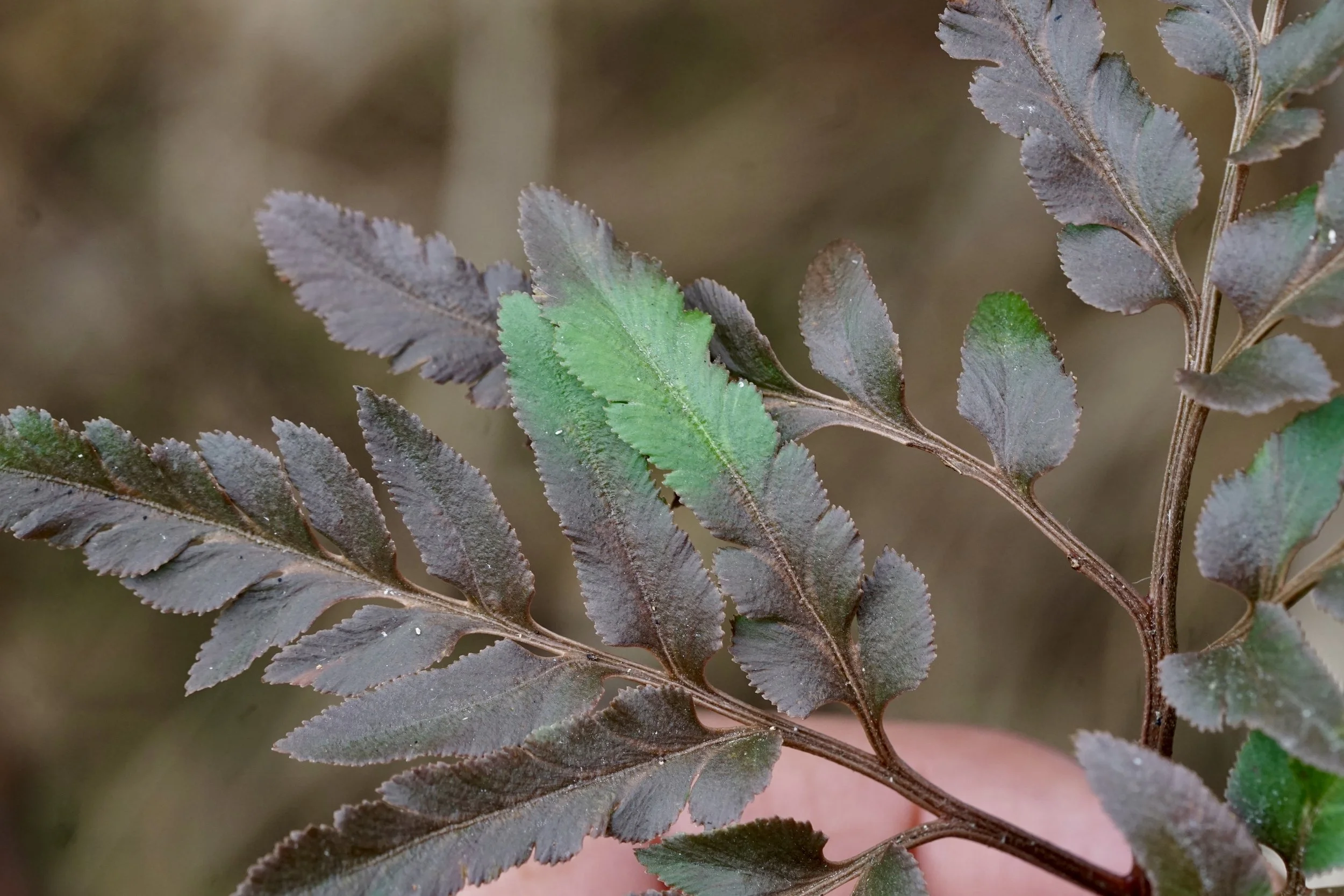 The red pigments in Sceptridium dissectum are inducible in the winter sun. Note the green portion of the leaf was shaded by another leaflet.