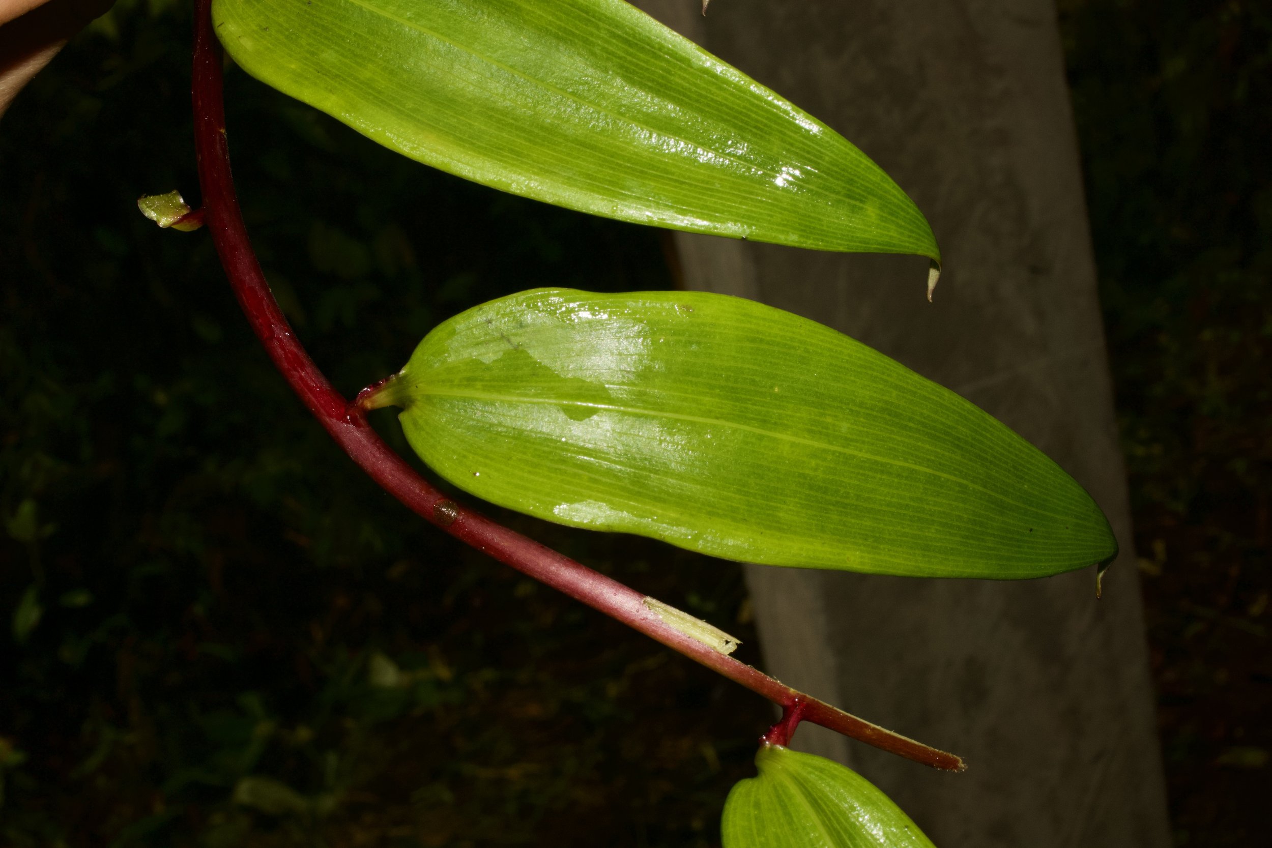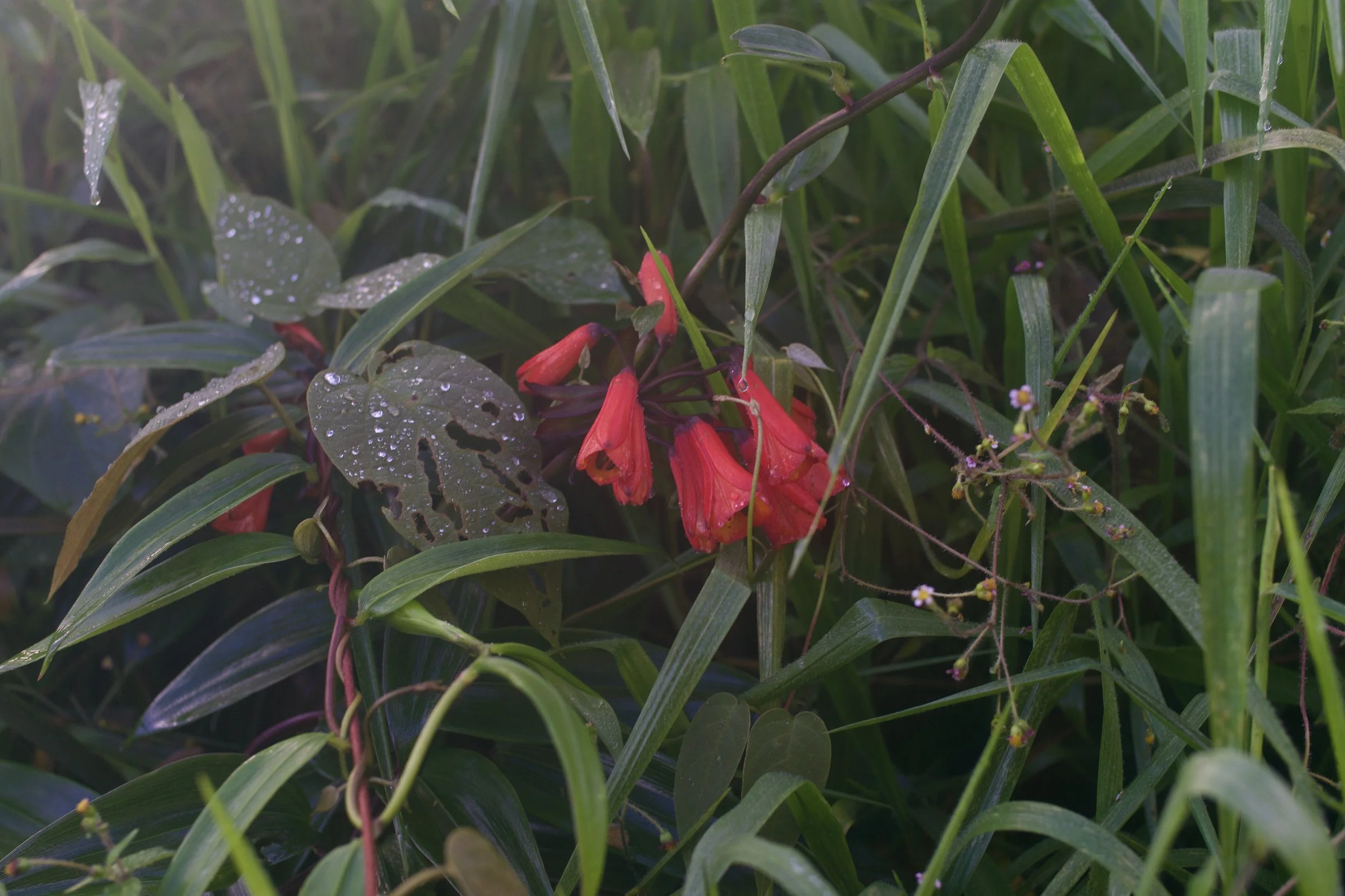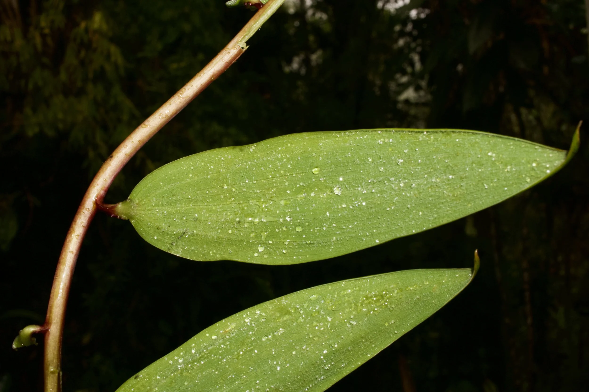 In Reserva Dracula, one plant that stood out to me was one that I have seen many times before, Bomarea, a monocot vine that is related to lilies. There are about 250 species of Bomarea, they all have gorgeous pendulous flowers with sepals and petals relatively undifferentiated (sometimes called tepals). Over dinner John mentioned that their leaves are resupinate—a term usually used for flowers which means they contort 180˚ during development. Many orchids often have resupinate flowers. Resupinate leaves? This was something I had never seen before or even heard of. I ran to the plant and using my headlamp carefully examined the foliage. It was fascinating. It is not just that the leaves are turned 180˚ but the developmental upper side of the leaf—usually waxy and adapted to capture sunlight—resembles what I would traditionally consider the lower side of the leaf, and vice versa. In fact, the anatomy of the leaf has also seemed to flip, according to Lyshede (2002) the layer of cells used to capture light called the palisade layer (usually on the upper side of a leaf) is found on the lower side of Bomarea leaves. The mechanism of resupination is also fascinating, the leaves of Bomarea and their relatives always seem to twist in the same orientation according to Chitwood and colleagues (2012). The leaf rotation seems to be a response to light dynamics too, some Bomarea can even rotate their functionally-top lower surface towards a light source leading to an untwisted or a double twisted leaf (Hill 1939).