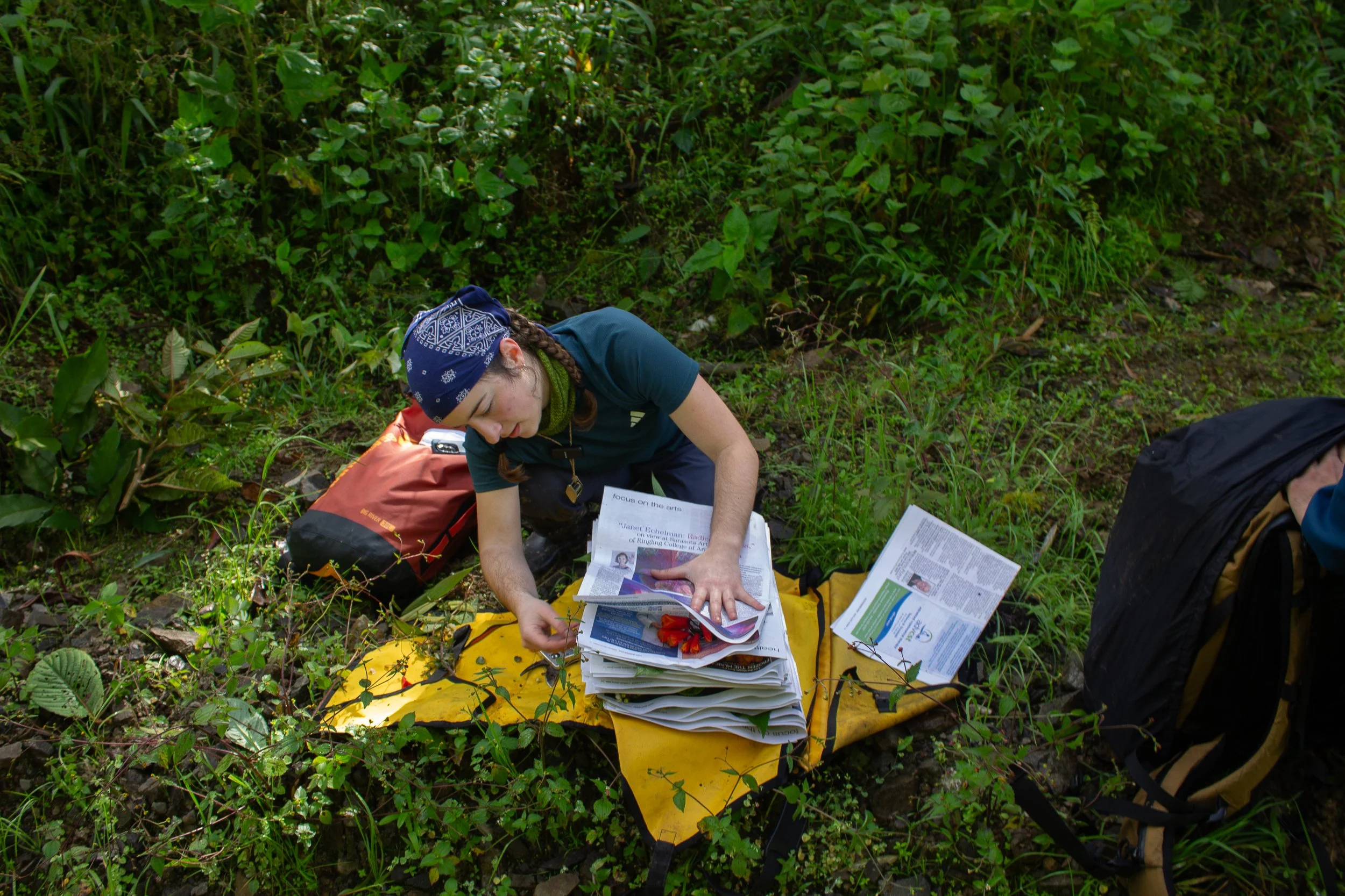 The goal of the expedition was to collect plants, so we quickly set up our tents and rushed to grab the final hours of daylight. It was raining when we arrived around 3pm, but we went fast through the trail. John and Magsy grabbed the herbaceous flowering plants, focusing on Gesneriaceae and Melastomataceae (two diverse groups of flowering plant herbs). Emilio and I snagged the ferns. The sheer diversity of these forests is overwhelming. Especially the first day. Everything is new when you have not collected a single plant yet. If the goal is to document everything, you must start somewhere. Wet and a bit chilly—we were at 2,500 meters in elevation—we trekked back and started to process everything. This is fun but slow, meticulous, and tiring. Each plant is photographed, tagged with a specific collection number, and pressed into herbarium specimens. This is like pressing a flower in between a book, but a bit larger and with more information. The pressing occurs between two pieces of newspaper. It is always comical to take a peek at the paper while pressing —in this case John brought his favorite newspaper “West Coast Women” which included random ads for life coaches, new mother-daughter cupcake stores, and other South Floridian goings on. Once the plant is placed in the newspaper, it is then labeled with the appropriate number and pressed tightly so the plant dries. The issue is that nothing dries in the Chocó. So, to inhibit molding we had to drench the specimens in alcohol; this inhibits fungal and pathogen growth, but the tradeoff is that the specimen’s color darkens and DNA cannot be extracted from the specimen in the future. Once all the specimens are pressed we then take detailed field notes about where the plants were collected, recording information such as their geographic coordinates, elevation, growth habit, co-occurring plants, and any further information. This is the metadata that becomes associated with the plant in perpetuity. In just an hour on the trail we collected around 20 fern species, the total processing took about 3 hours.
