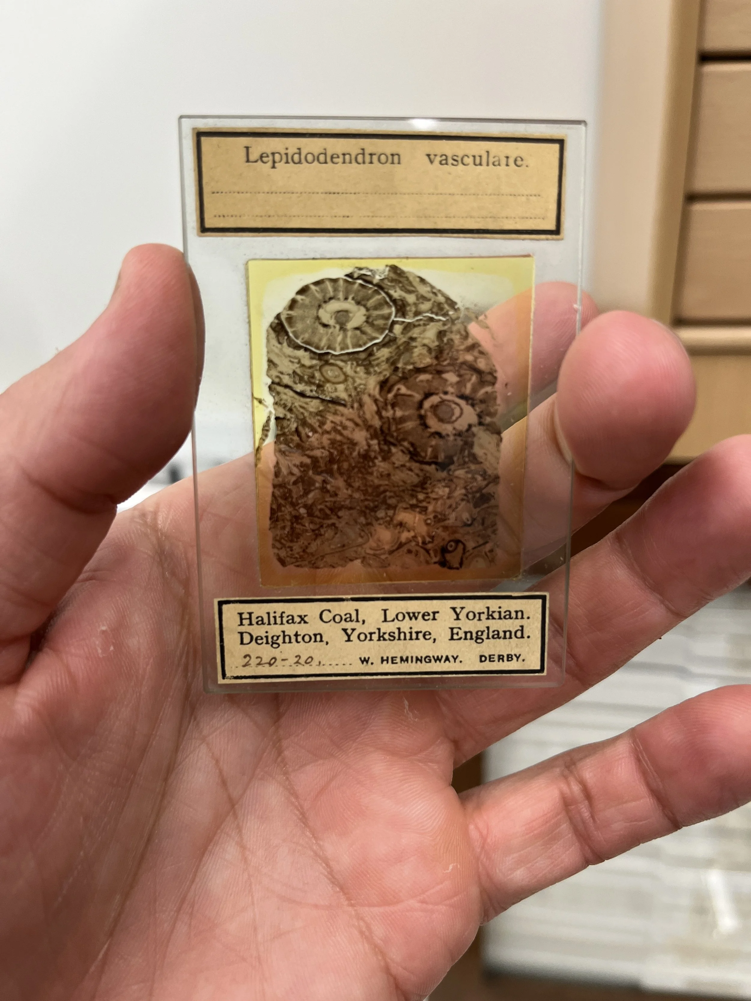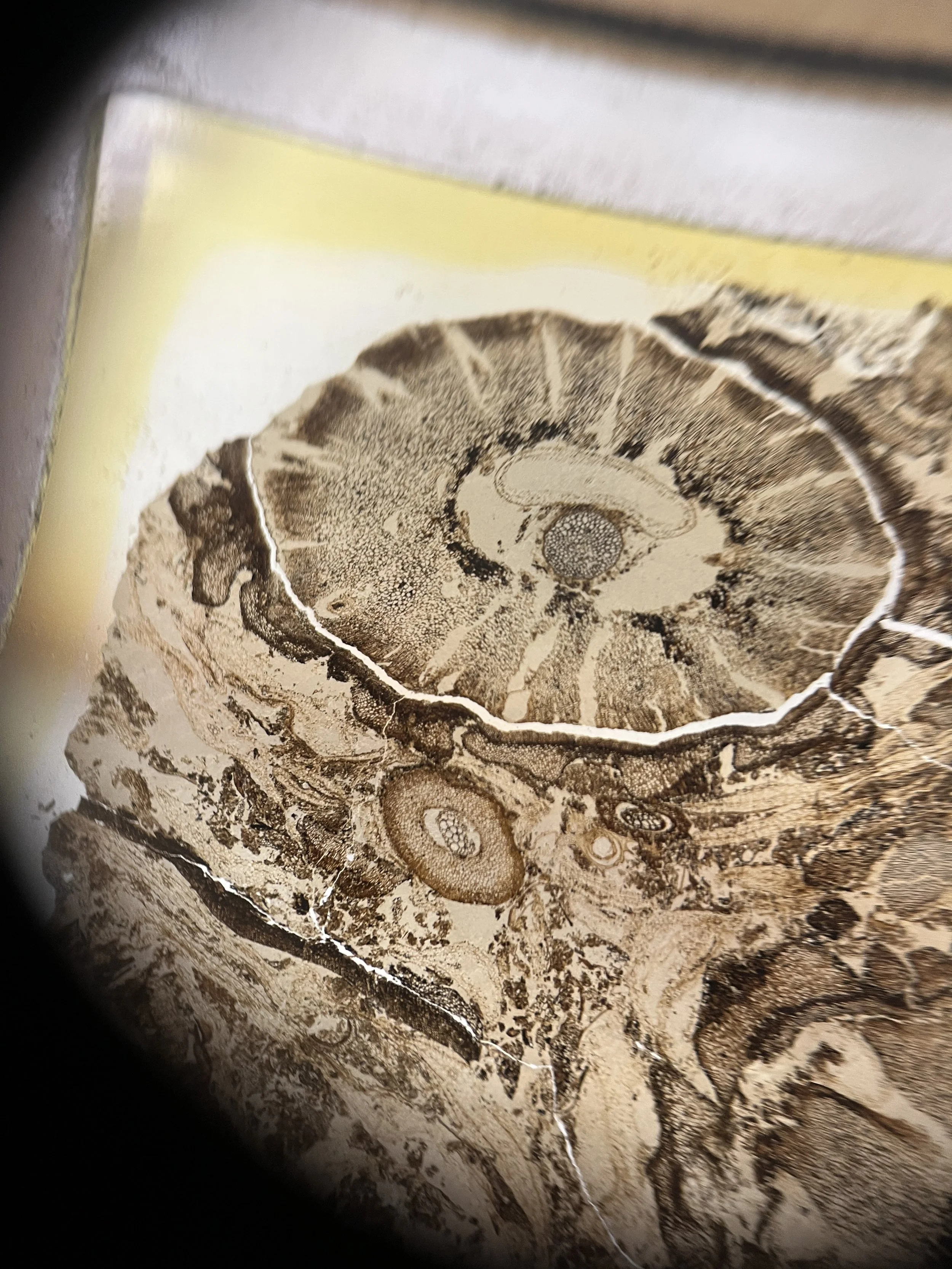 Microscope slide prepared from fossils showing the vasculature of Lepidodendron. The anatomical detail can be observed in these perfectly preserved rocks.