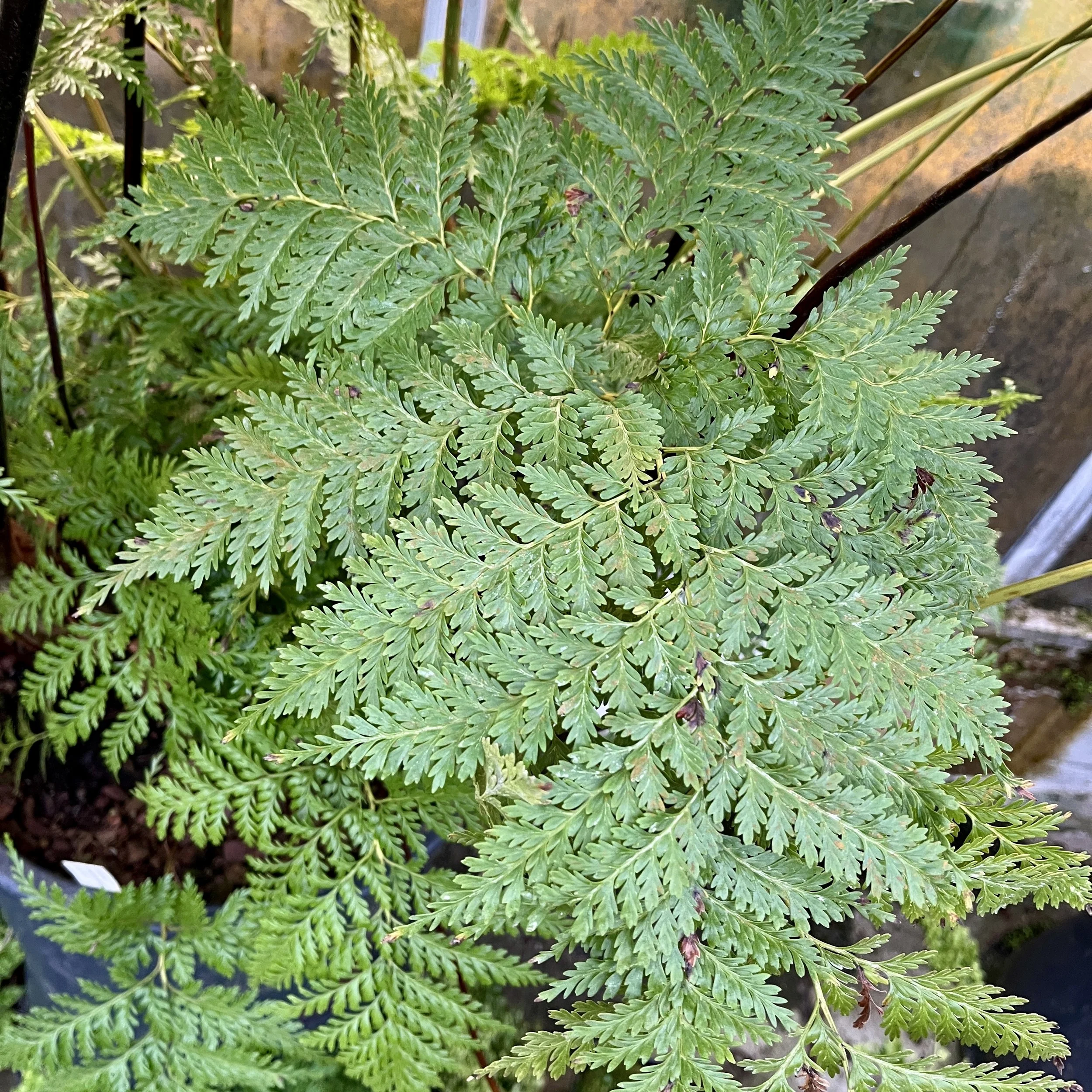 Of course, the ferns are not restricted to fossil deposits of the Carboniferous. While I didn't have time to botanize the Scottish countryside, I was able to spend a full day at the Royal Botanic Garden Edinburgh with my colleagues Michael Sundue, Magsy Lombard, Alex Quinlan, and Sannie Fu. Our day was spent gawking at ferns. What a collection they have! Never have I seen such a fascinating array of cultivated species. They grew plants from nearly every tip on the fern tree of life and every corner of the world. Some highlights include Hymenophyllum reniforme, which was a showstopper; the heart-shaped leaves and bifurcating veins made the plant look more like Ginkgo leaves than any fern fronds.