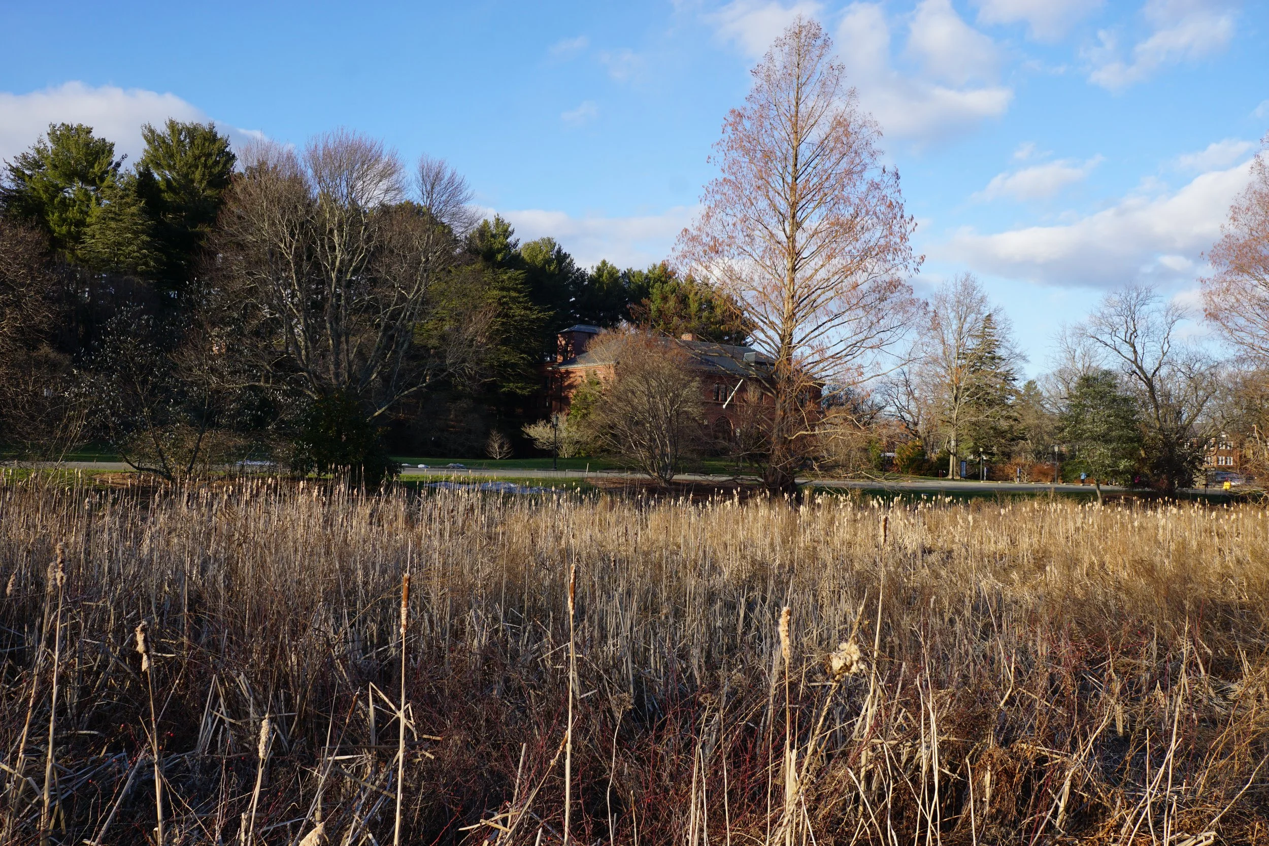 Dawn redwood in winter in the distance. Planted in front of the Hunnewell Building at the Arnold Arboretum of Harvard University.